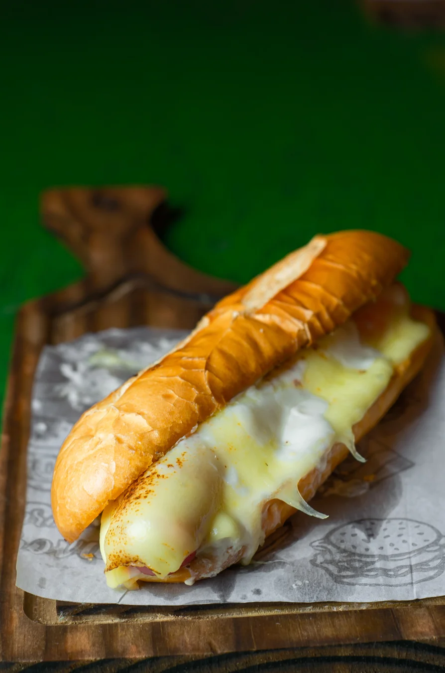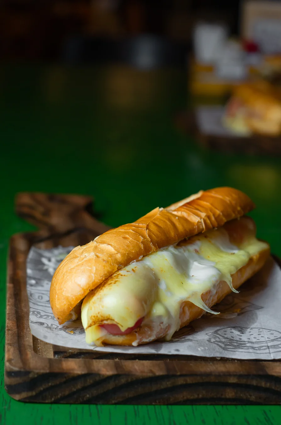 Linguiça mineira artesanal de porco, queijo mussarela derretido e maionese aioio no pão artesanal de brioche