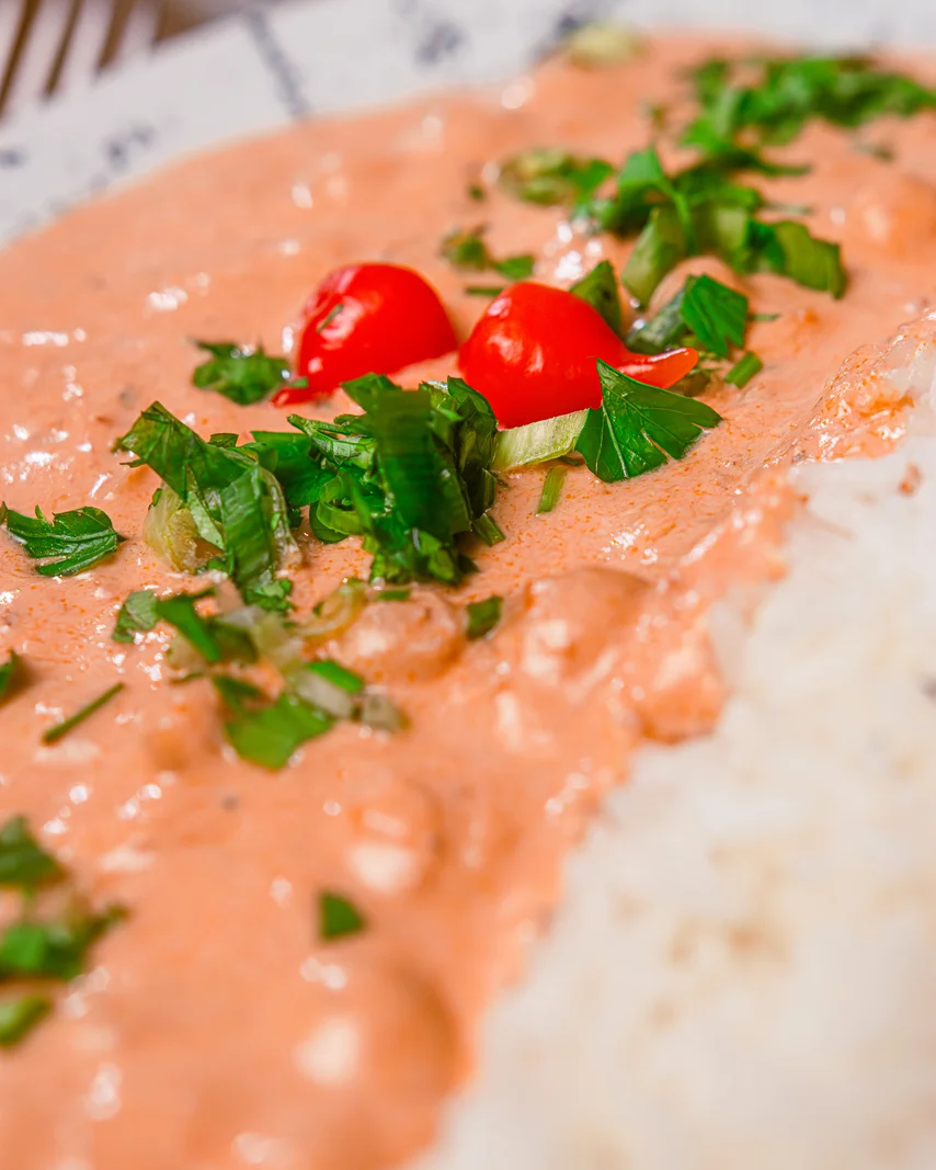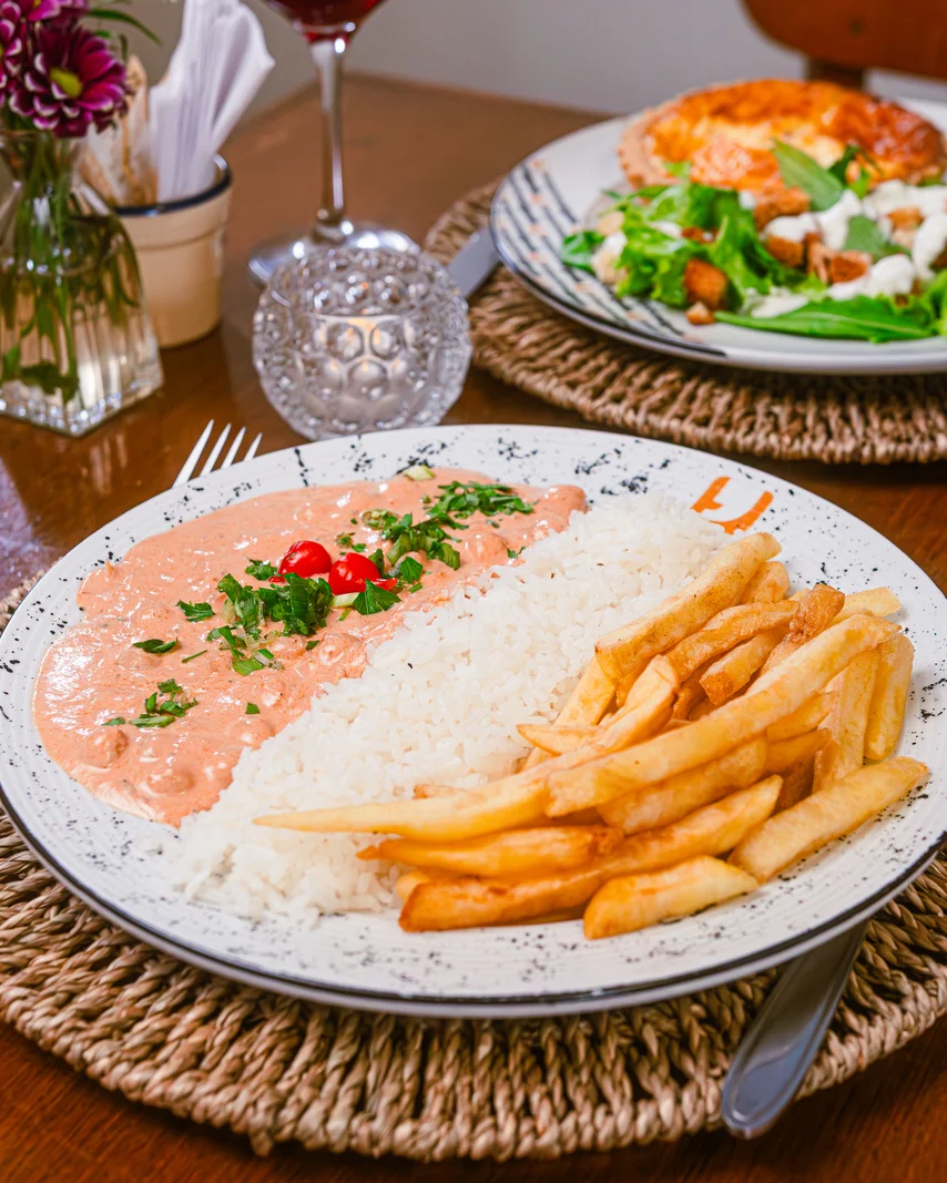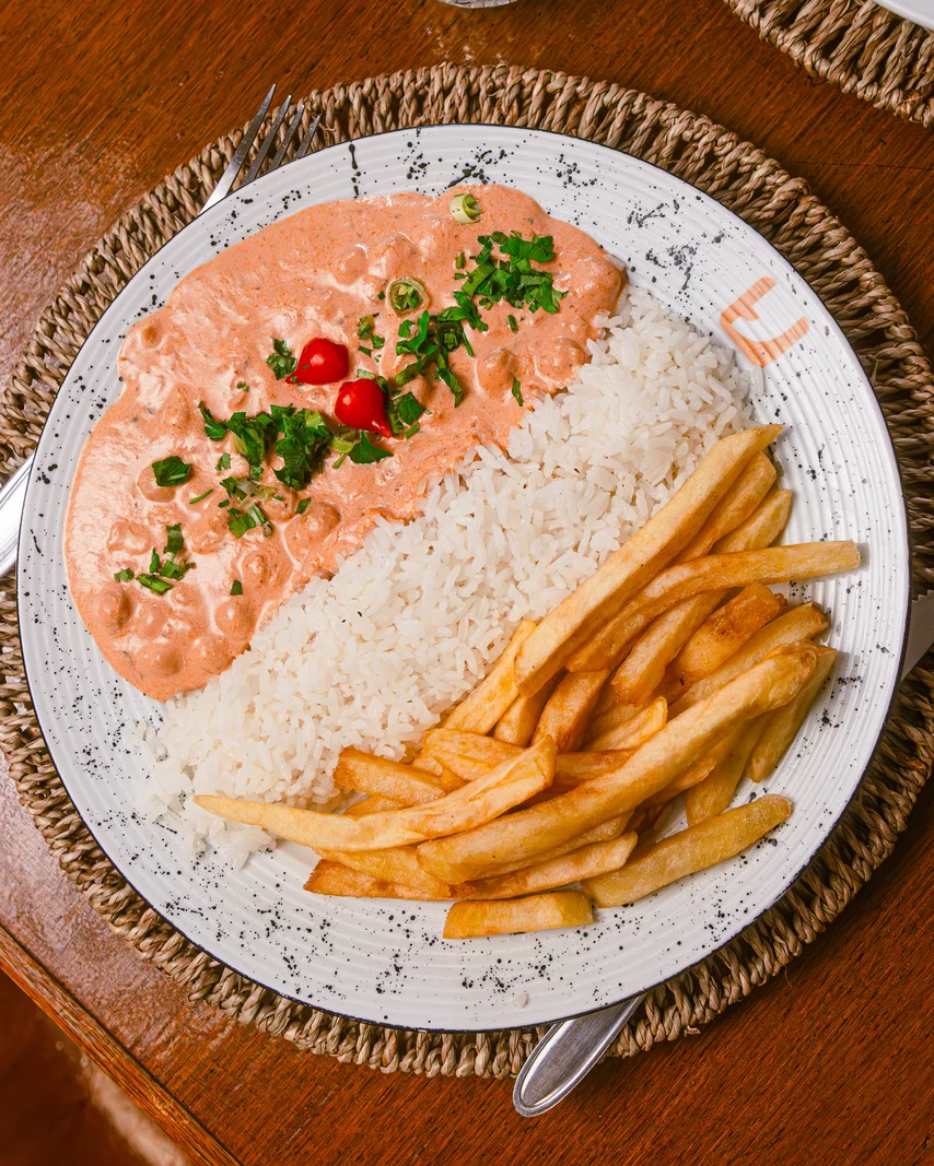 Com creme de aveia, acompanha arroz branco e fritas - a salada de entrada vem sem molho.