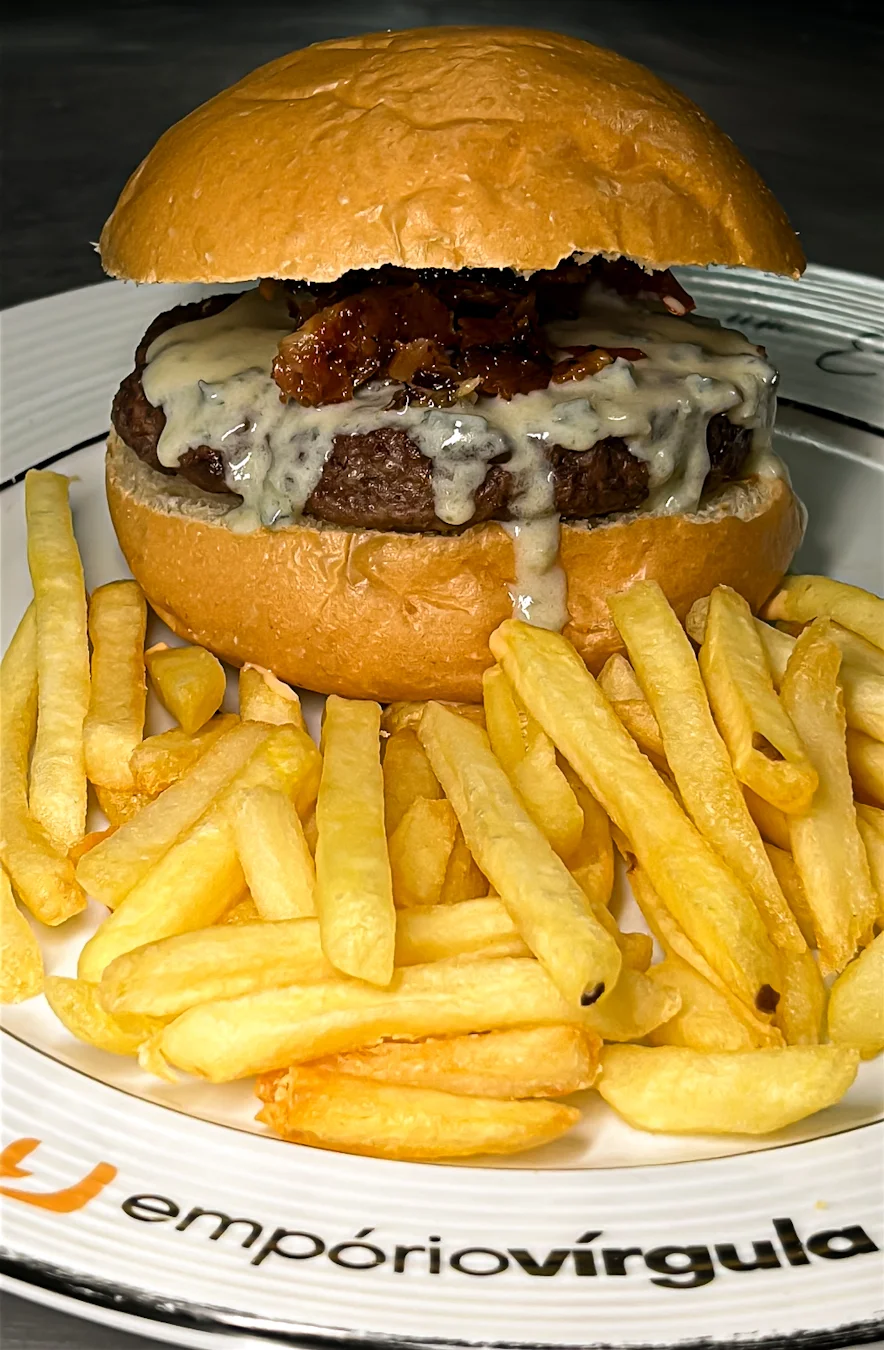 150g de blend de fraldinha, queijo gorgonzola, bacon, acompanha fritas